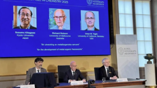 2025 年 10 月 8 日北京時間 17 時 45 分許,瑞典皇家科學院決定將 2025 年諾貝爾化學獎授予北川進(Susumu Kitagawa)、理查德·羅布森(Richard Robson)以及奧馬爾·M.亞吉(Omar M. Yaghi)三位科學家,以表彰其在金屬有機框架開發領域的貢獻。