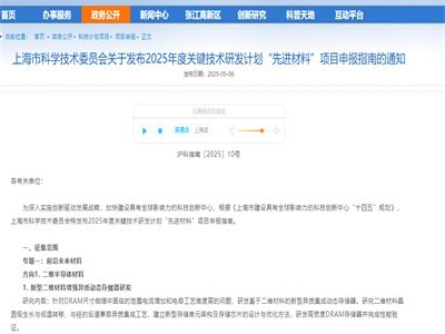 5月6日,上海市科學技術(shù)委員會發(fā)布2025年度關鍵技術(shù)研發(fā)計劃“先進材料”項目申報指南。