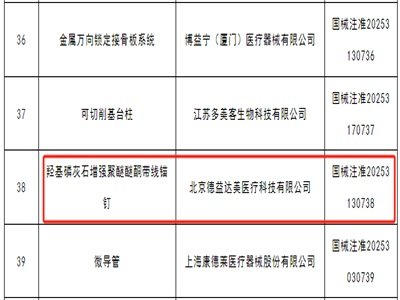2025年4月,國家藥監(jiān)局共批準注冊醫(yī)療器械產(chǎn)品266個。其中,北京德益達美醫(yī)療科技有限公司的羥基磷灰石增強聚醚醚酮帶線錨釘獲批。